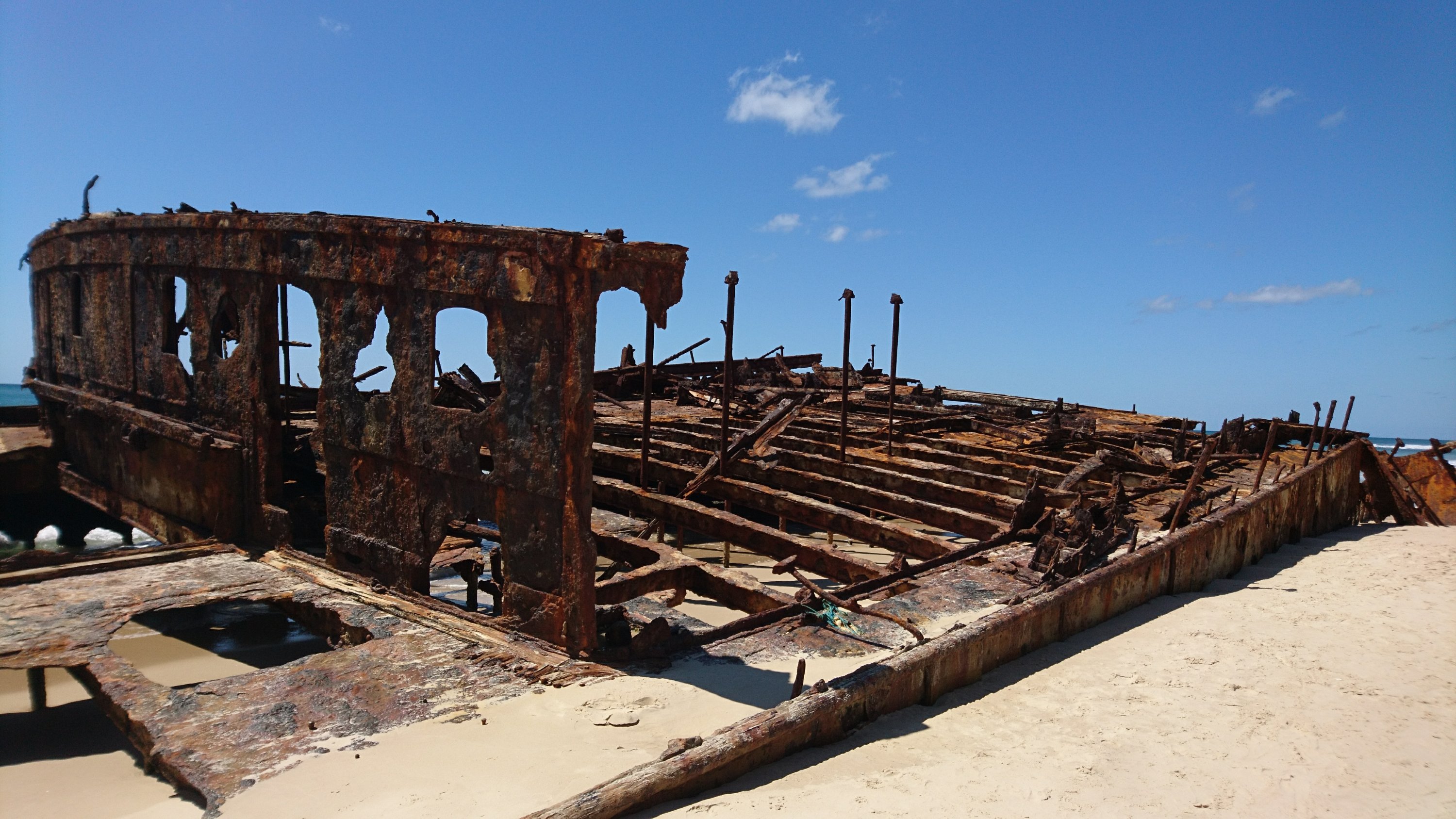 Wir machten uns also mit dem 4×4 Jeep auf den Weg zu einem versunkenen Schiff, bei welchem die rostigen Überreste am Strand liegen. Das heutige Maheno Wrack, war früher ein Luxusschiff, welches um ca 1905 zwischen Australien und Neuseeland Fahrten anbot.