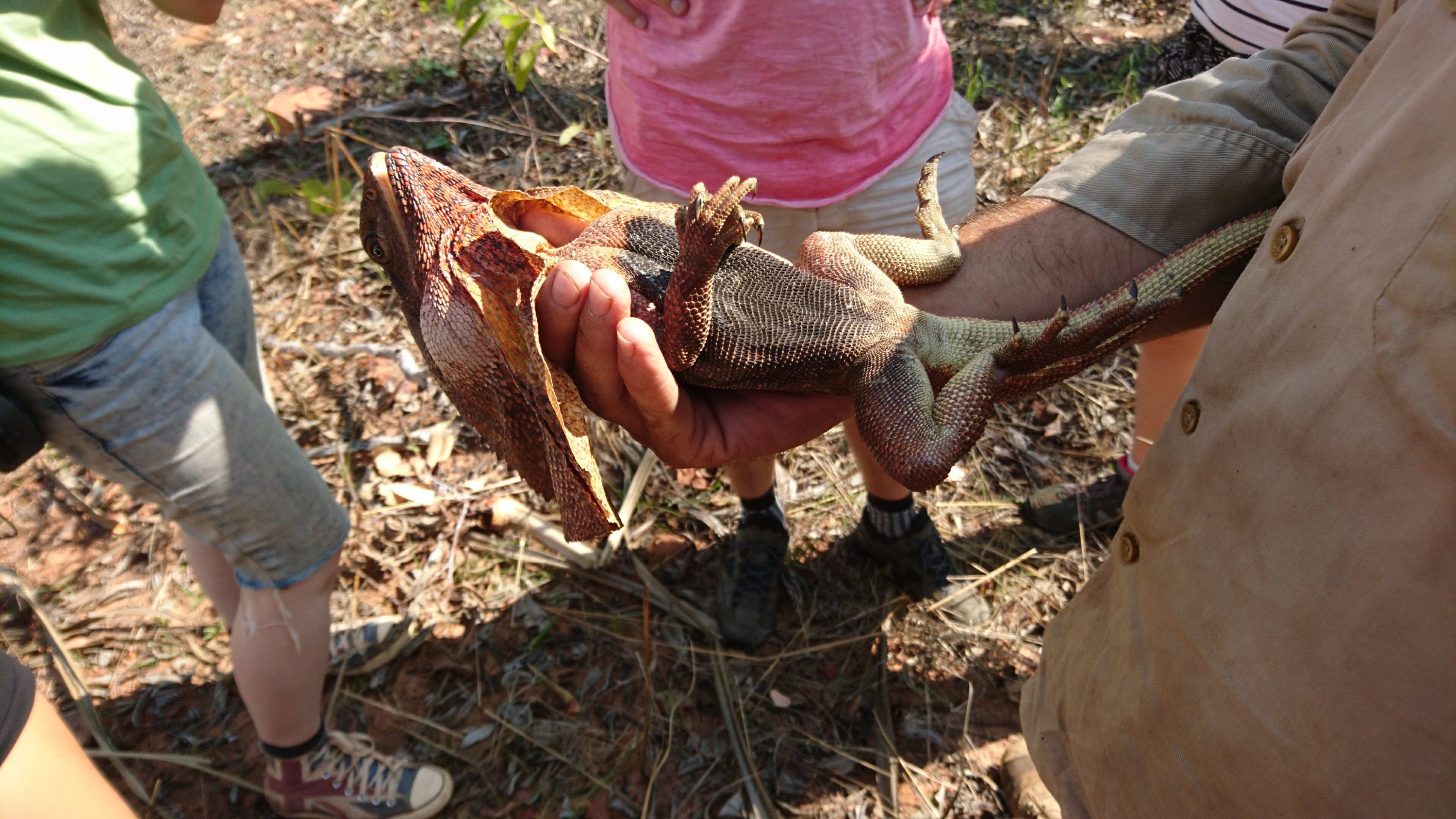 Wieder einmal mehr musste ich den Wecker stellen :). Der Tourguide, welcher mich um 7 Uhr abholte, war ein richtiger Australier vom Outback. Loch im Hut, einem schmutzigen Ranger Outfit und ungepflegter Bart mit viel KnowHow über die Region und deren Tiere. Wir fuhren also im Jeep in Richtung Litchfield Nationalpark. Dieser ist näher gelegen und kleiner wie der Kakadu Nationalpark. Nun ja man fährt „nur“ 2h :). Auf dem Weg dorthin, entdeckte unser Guide eine Kragenechse auf der Strasse. Sofort stieg er aus und folgte dem Tier in den Busch. Mit blossen Händen fing er das flinke Tier und kehrte zu uns zurück. Vielleicht kennt ihr die Kragenechse aus dem Disney Film Bernard und Bianca 🙂