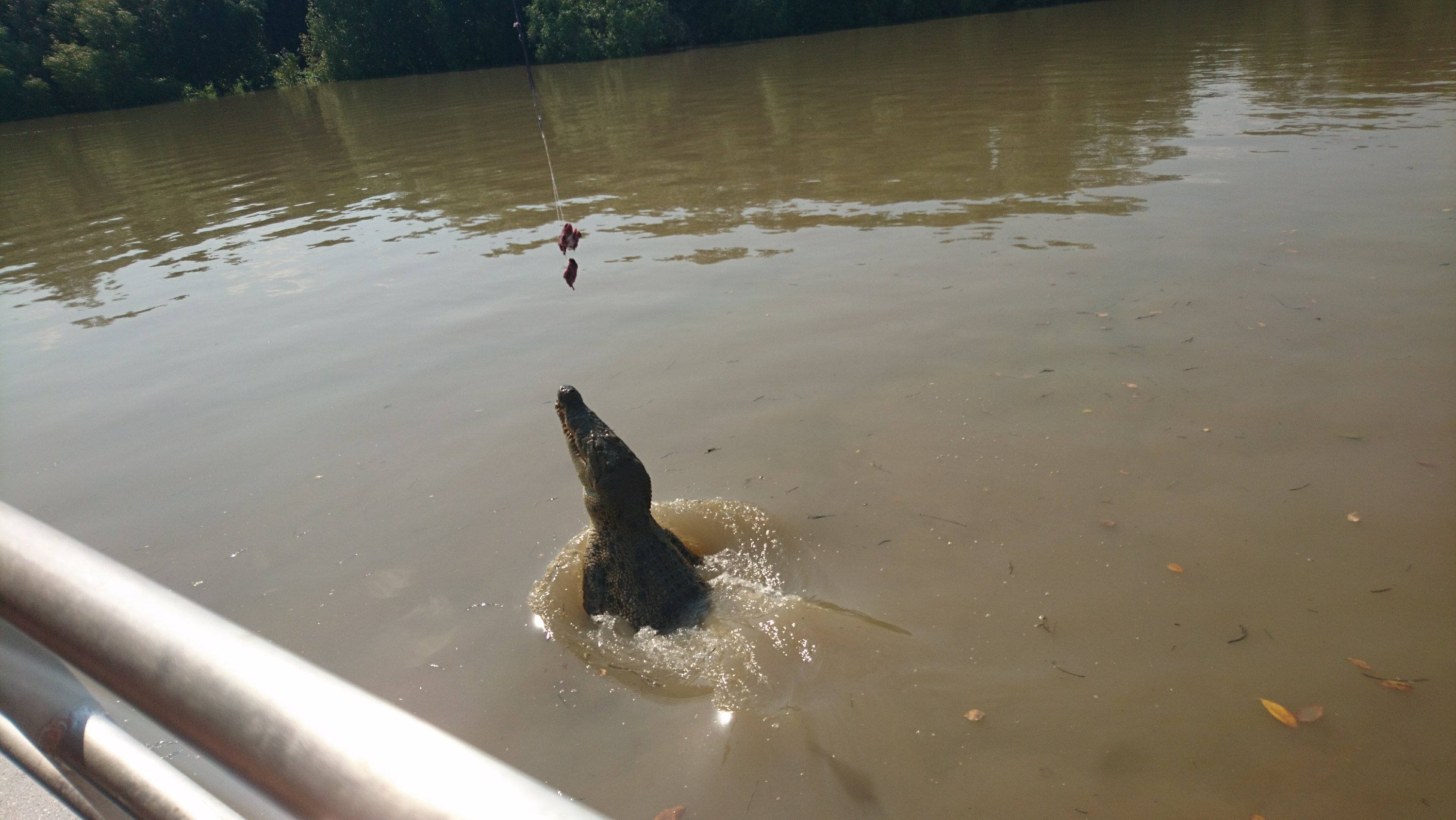 Der zweite Tag meiner Tour startete mit einer Bootsfahrt auf dem Adelaide River. Wir sollten wilde Krokodile sehen, die zudem aus dem Wasser sprangen. Jumping Crocodiles nannte sich die Tour. Ich war gespannt und beobachtete die Frau, welche mit einer Art Angelrute und zwei Stück Fleisch als Köder versuchte die Krokodile an die Wasseroberfläche zu locken. Erstaunlicherweise haben sich die wilden Krokodile an den Motorenlärm vom Boot gewöhnt und wissen, wenn das Boot kommt, dass es was zu Fressen gibt. Um die leckeren Büffelfleischstücke zu kriegen, liess die Frau die Krokodile mehrmals aus dem Wasser springen. Es hatte ein wenig was von Zirkus, aber nichts desto trotz waren die Tiere frei lebend und taten dies aus eigenem Willen.