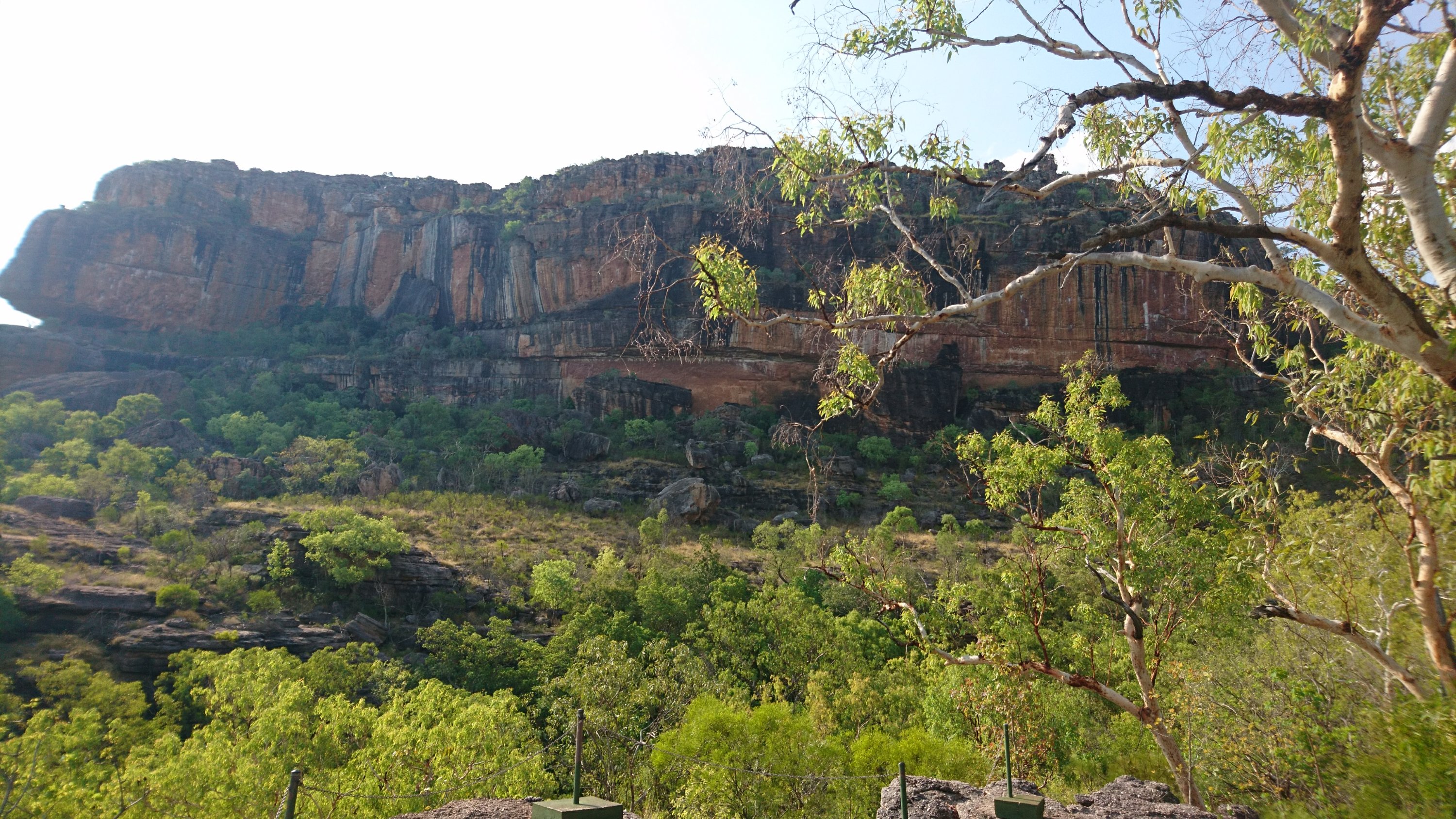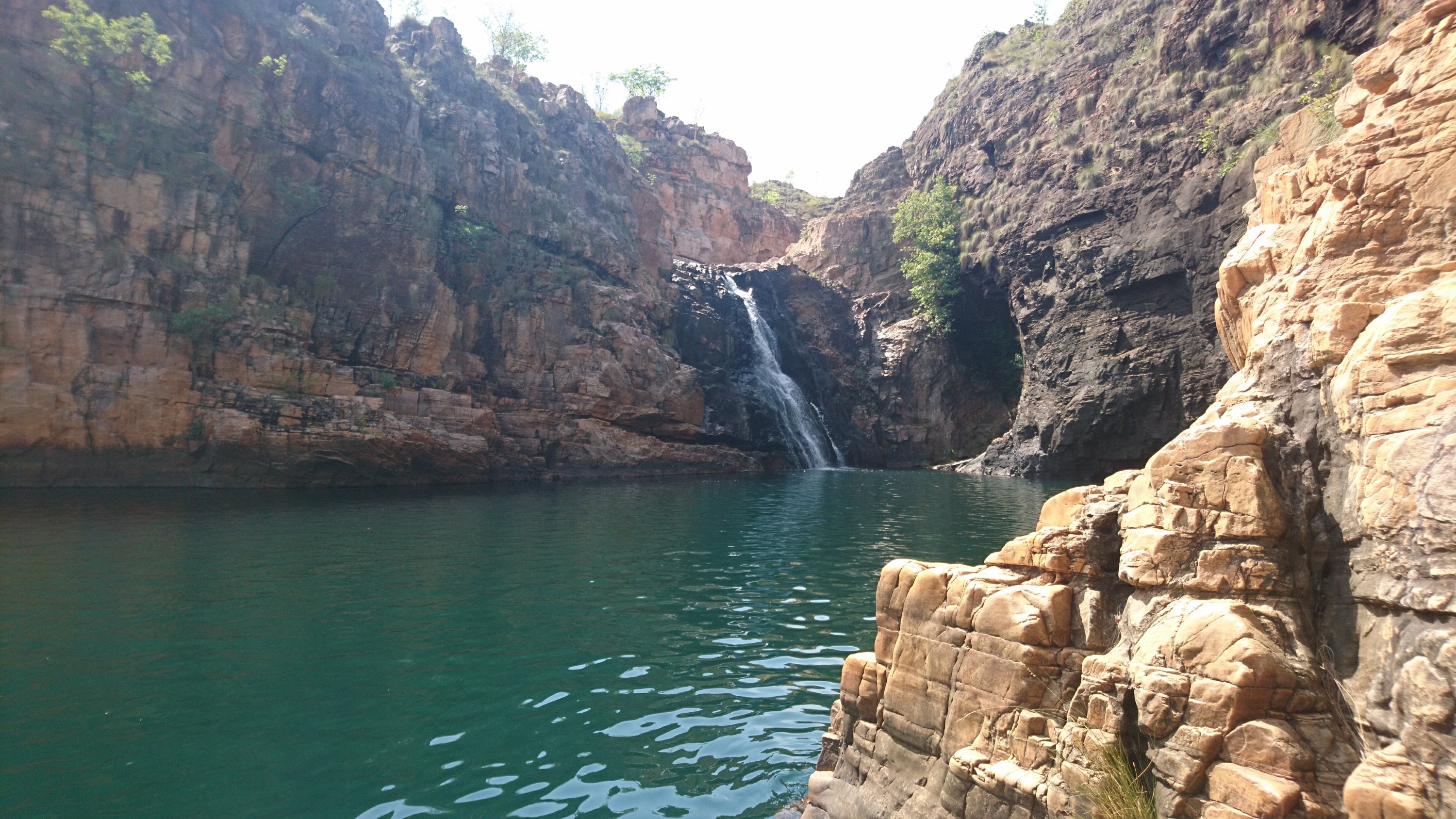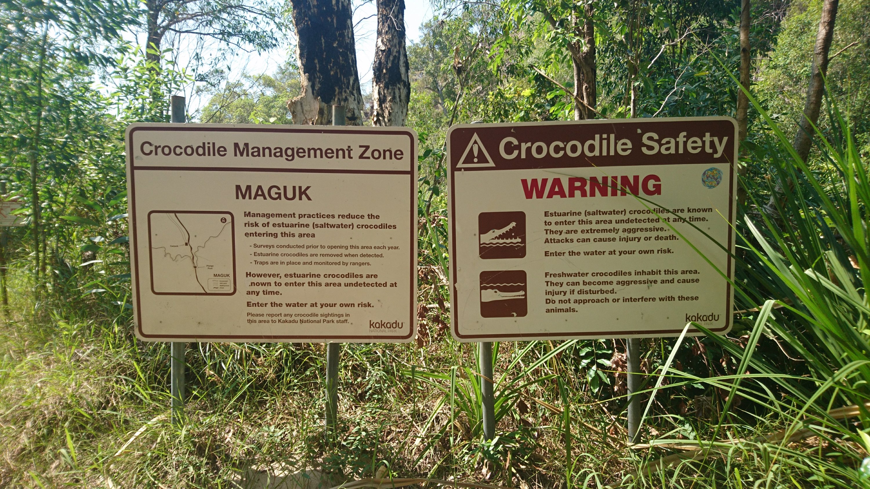 Es ist schon erstaunlich, wie die Aborignis über Jahrtausende in dieser Kargen Gegend leben konnten bzw können. Wir wanderten also ein Stück, geplagt von den vielen Fliegen, die extrem hartnäckig an alle möglichen Stellen im Gesicht flogen. Zum Teil versuchten sie sogar in den Mund oder die Nase hineinzukommen. Ich fühlte mich wie eine Kuh, die ständig ihren Kopf schütteln muss, um die lästigen Fliegen loszuwerden. Abgsehen von den Fliegen, war die Landschaft war sehr schön. Wir durften wie den Tag zuvor auch wieder baden gehen. Nur gab es hier im Park Krokodilwarnschilder auf denen Stand, dass das Gebiet zwar mit Fallen gesichert wird, aber es trotzdem sein kann, dass sich Krokodile unentdeckt bleiben. Schwimmen auf eigene Gefahr! Unser Tourguide versicherte uns, dass es heute keine im Wasser hätte. So etwas ist leicht gesagt wenn man selber keine Badehose an hat 🙂