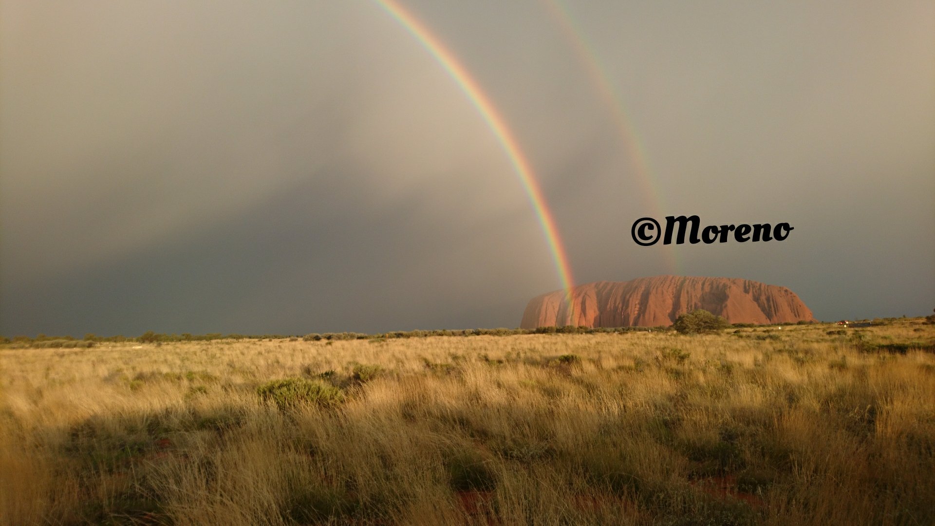 Die Wanderung half mir ein wenig, mich zu beruhigen. Wir machten uns anschliessend auf den Weg zum Sonnenuntergang Lookout Point. Nun ja ich erhoffte mir nichts Spektakuläres, war doch der Himmel immer noch verdeckt. Es kam aber wieder anders als erwartet. Petrus schien mitleid mit mir zu haben. Der Himmel öffnete sich langsam und die Sonne konnte zum Teil durchdringen. Ihr wisst ja was Regen und Sonneschein gleichzeitig ergeben. Ja, es enstand ein Regenbogen über dem Uluru! Dieser Anblick war wirklich eine Seltenheit, unsere Tourguide kam sogar ins schwärmen und machte kräftig Fotos. Was für eine Wende. Die betrübte Stimmung, der meisten Leute, ausgenommen Daniel, der zu jeder Zeit an einen spektakulären Sonnenuntergang geglaubt hatte, verbesserte sich blitzartig. (Randnotiz: Daniel glaubte auch daran das Schweden sich für die Fussball WM qualifizieren würde). Überall lachende Gesichter, Selfie-Posen, Gruppenfotos, es wurde geknipst bis die Finger glühten.