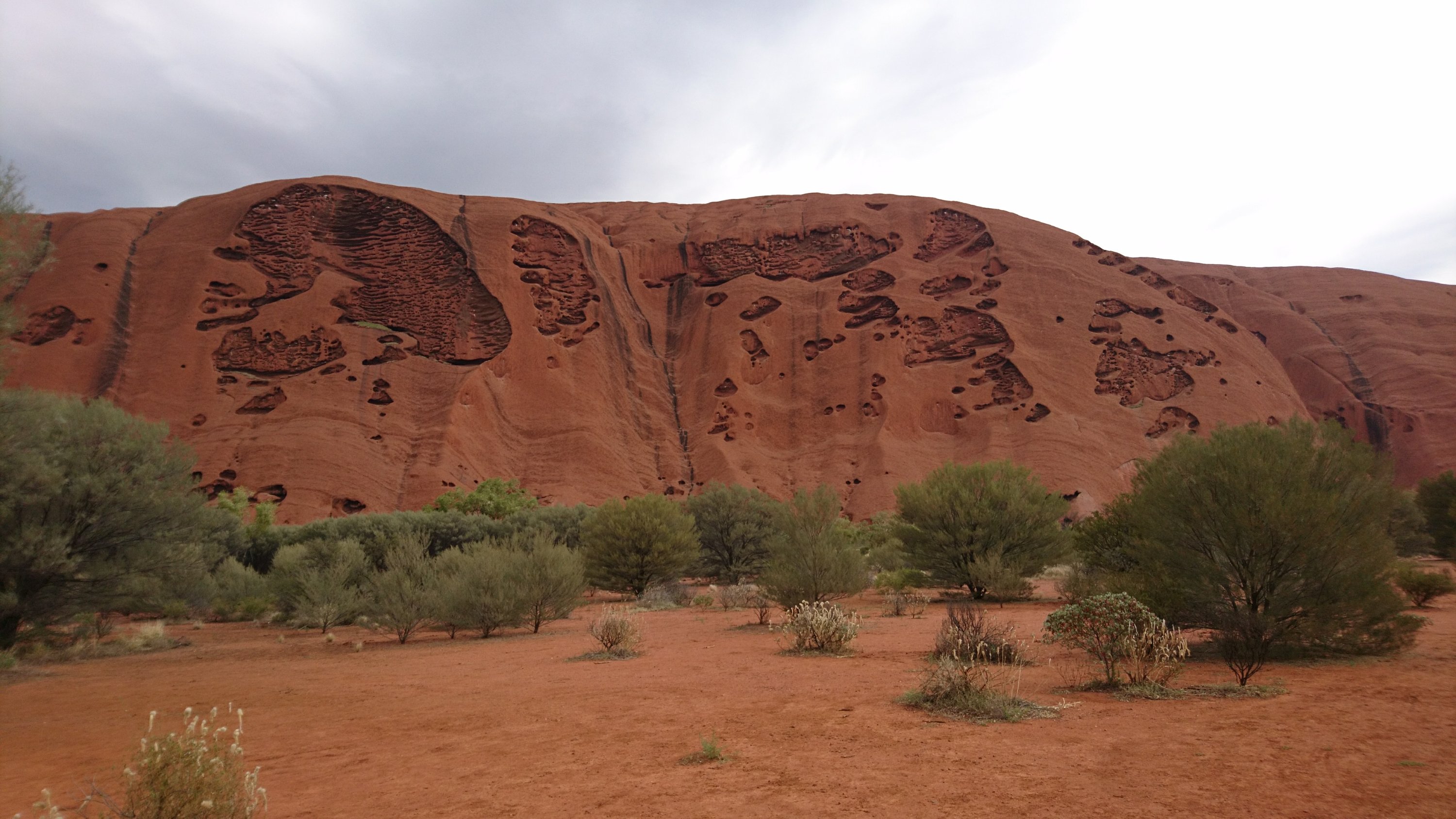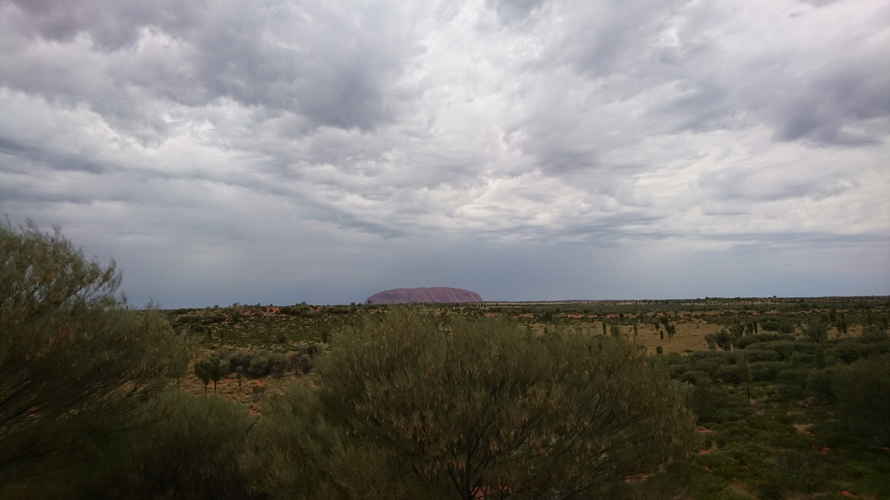 Daraufhin ging die Fahrt weiter. Es ist schon merkwürdig, in der Schweiz sind bereits 1h 30min eine lange Fahrt, aber hier in Australien ist dies ein Katzensprung. Seit ich hier bin, ändert sich meine Wahrnehmung für kurze oder weite Autofahrten und es wird einem bewusst wie schnell man eigentlich in der Schweiz überall sein kann. Nach einigen Stunden war es dann soweit, der rote Felsen konnte man auf der ebenen Fläche bereits von Weitem sehen. Zu diesem Zeitpunkt hatte ich gemischte Gefühle. Zum Einen war ich überwältig von der Grösse des Uluru und zum Andern haderte ich mit dem Wettergott. Eigentlich wäre mir nie in den Sinn gekommen, im Vorfeld den Wetterbericht anzuschauen, sind wir doch in der Wüste und an einem der trockensten Orte der Welt! Tatsächlich war es genau an diesem Tag bewölkt und es regnete zwischendurch. Was für ein Pech muss man haben, bei einer Wahrscheinlichkeit von 0,5% (laut Tourguide) einen solchen Regentag zu erwischen. Unsere Tourguide meinte dann was für ein Glück wir hätten. Alles sei so „amazing“ und „beautiful“. Zuerst dachte ich, ich höre schlecht. Glück?! Hallo es regnete! Was soll da bitteschön Glück sein. Wenn ich Regen will, bleibe ich der Schweiz. Ich war sichtlich genervt und regte mich mehr auf, als dass ich die Situation geniessen konnte. Sybille schloss sich mir an, wenn auch nicht ganz so entnervt wie ich. Der Einzige der ruhig blieb war Daniel. Er versuchte die Situation schönzureden und uns ein wenig aufzumuntern. Leider mit mässigem Erfolg, aber an dieser Stelle ein grosses Dankeschön an dich 😉 . Mein Traum vom im Sonnenuntergang glühenden roten Felsen mit strahlend blauem Himmel war geplatzt. Die Wolken und der Regen machten ihn zunichte. Danke Petrus!!!