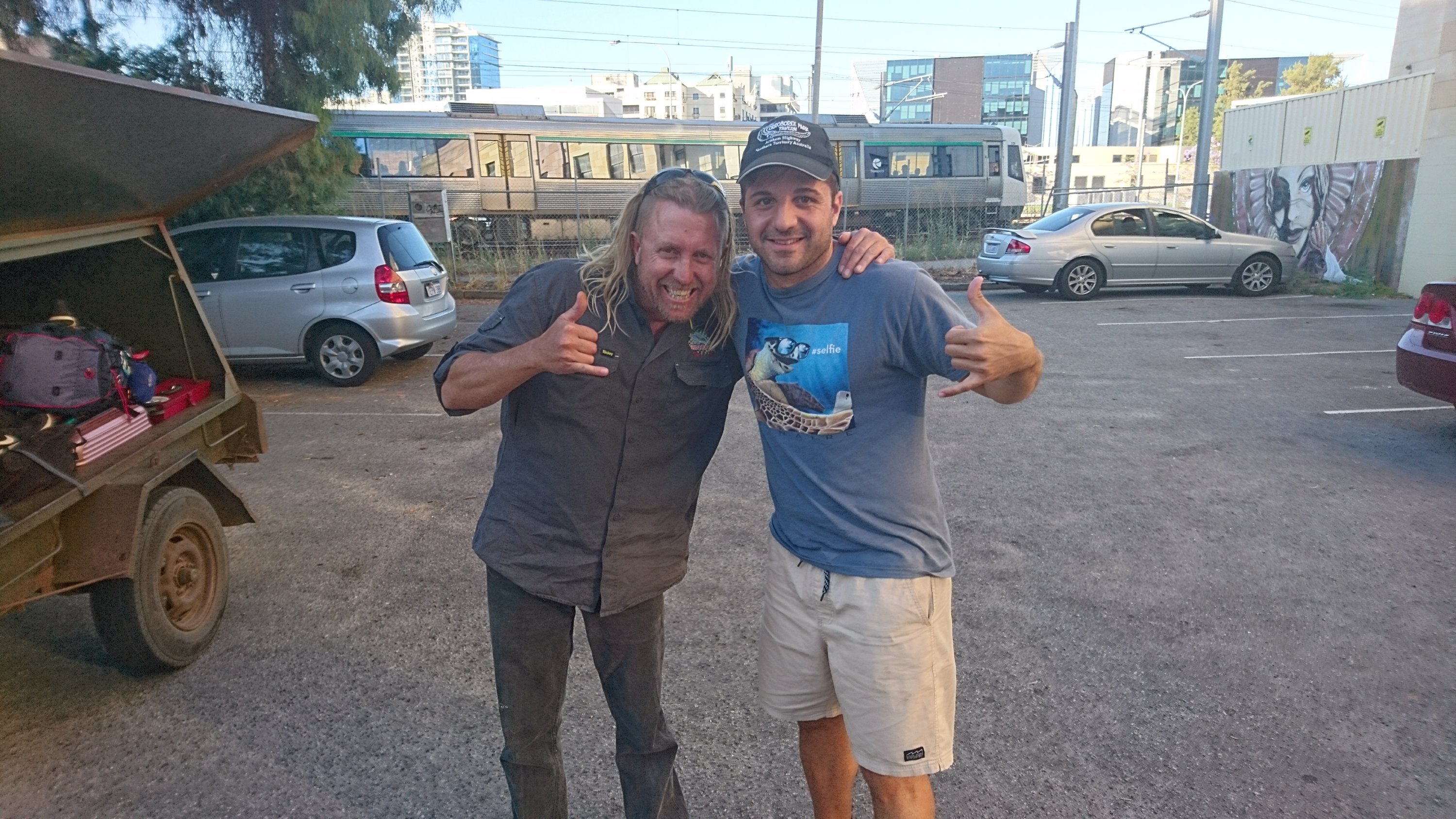 Nebst uns beiden bestand die Gruppe zu Beginn noch aus weiteren 10 Personen. Wobei einer der Gruppe sich so schlecht gefühlt hatte, dass er die Tour erst gar nicht antreten konnte und in Perth blieb. Auf die Leute werde ich im Verlauf der Story noch genauer eingehen. Unser Tourguide, der Walker, war ein typischer Aussie. Ich kann ihn nicht beschreiben, deshalb gibts ein Bild von ihm und mir 🙂