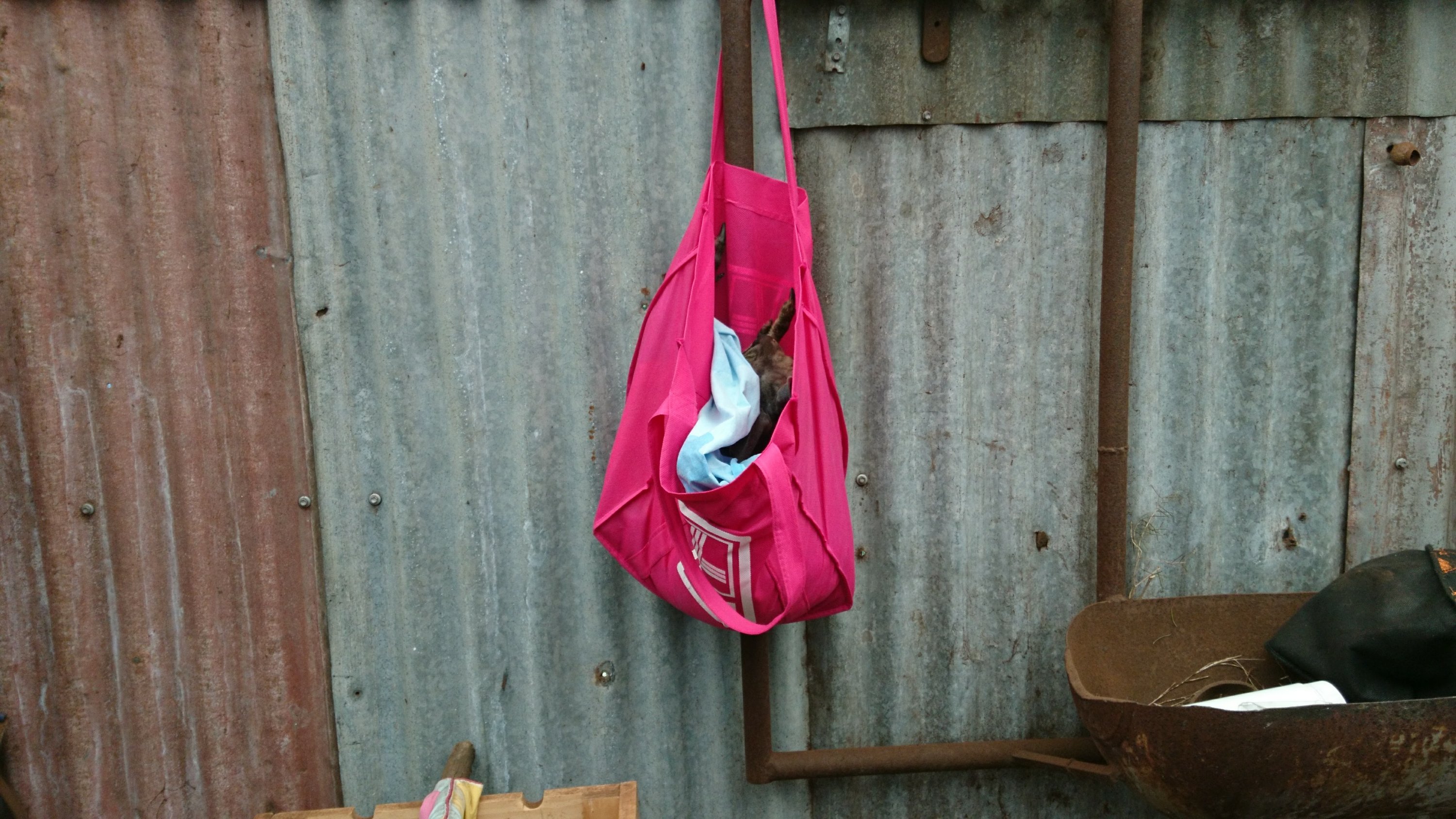 Ein Känguruhbaby in einer Einkauftasche, welches den Beutel der Mutter simuliert.
