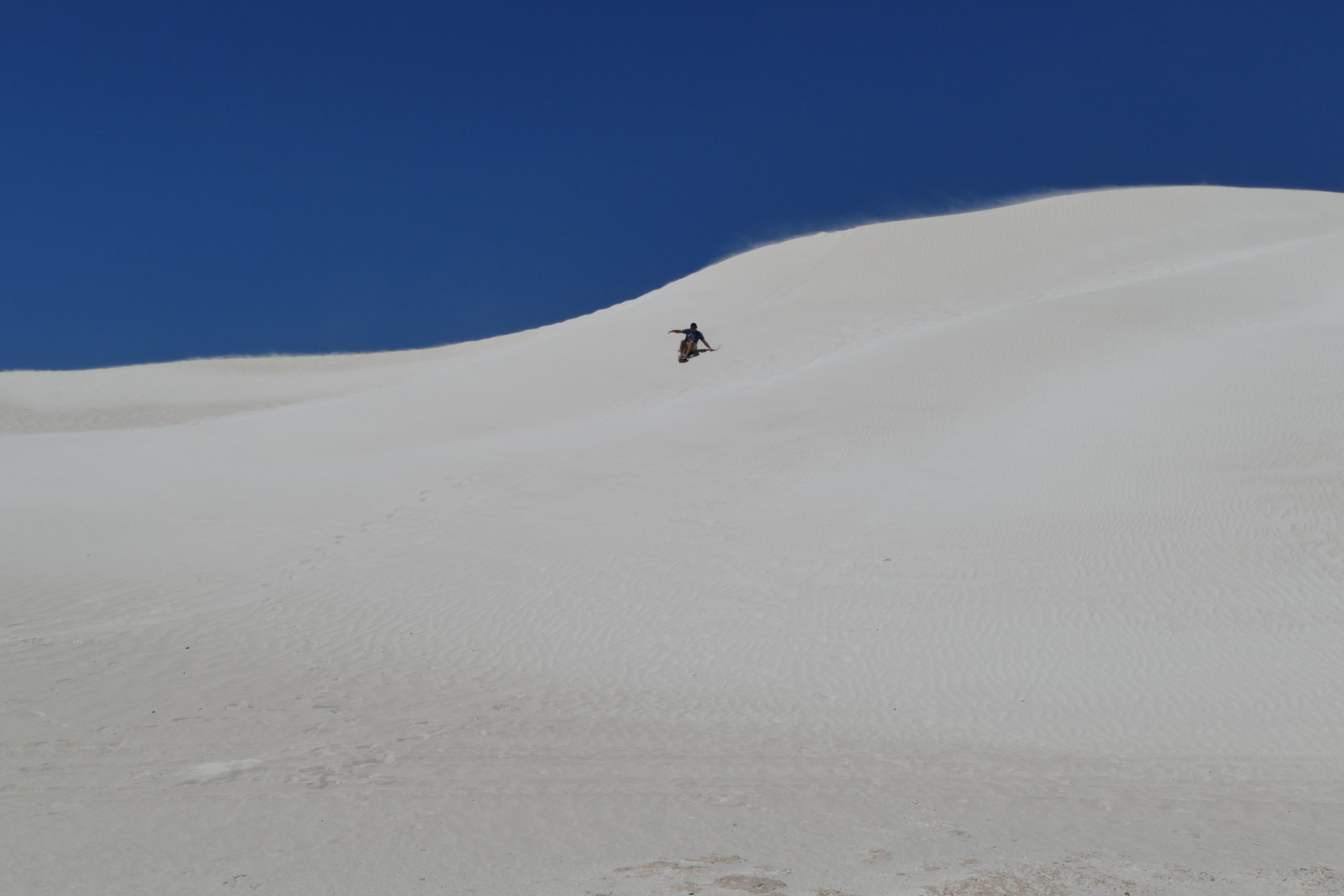 Am späteren Nachmittag ging es dann endlich zum Sandboarding. Auf dieses Ereignis hatte ich mich schon sehr lange gefreut. Walker fragte wer denn Lust hätte, das Sandboarden auszuprobieren. Es waren nur ich und die Engländerin, die es ausprobieren wollten. Für einmal hielten sich die Chinesen zurück ;). Als die Engländerin dann aber den Hügel sah, wollte sie nicht mehr und ich kletterte alleine mit meinem frisch gewachsten Board die Sanddüne hoch. Das Sandboarden hat ein wenig was vom Snowboarden, nur ist man barfuss und nicht auf dem Board befestigt, was die Sache ein wenig schwieriger macht. Es ist zwar anstrengend jedesmal die Düne raufzuklettern, aber es macht richtig Spass. Man sollte einfach schauen, dass man sich nicht verletzt 🙂