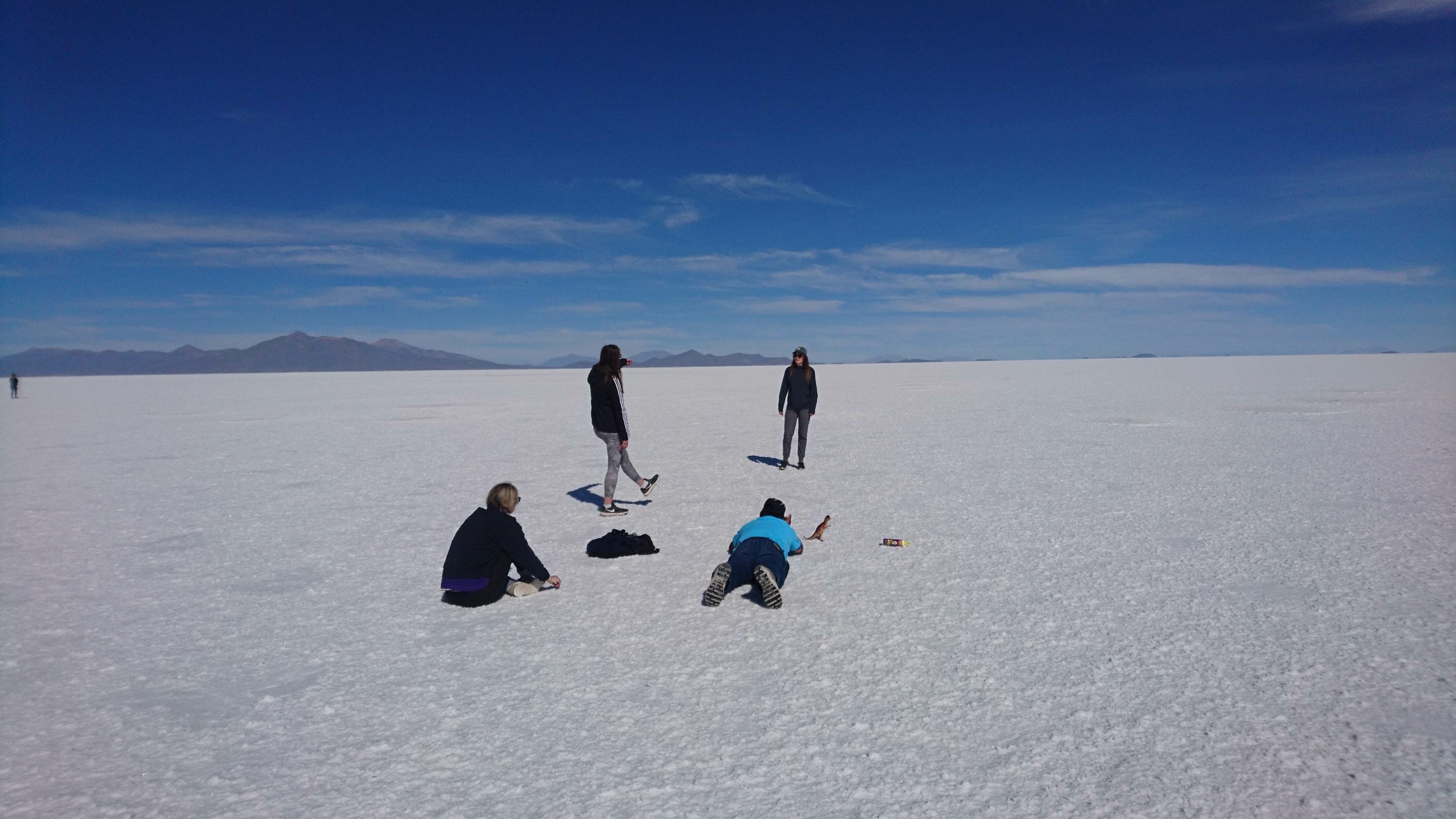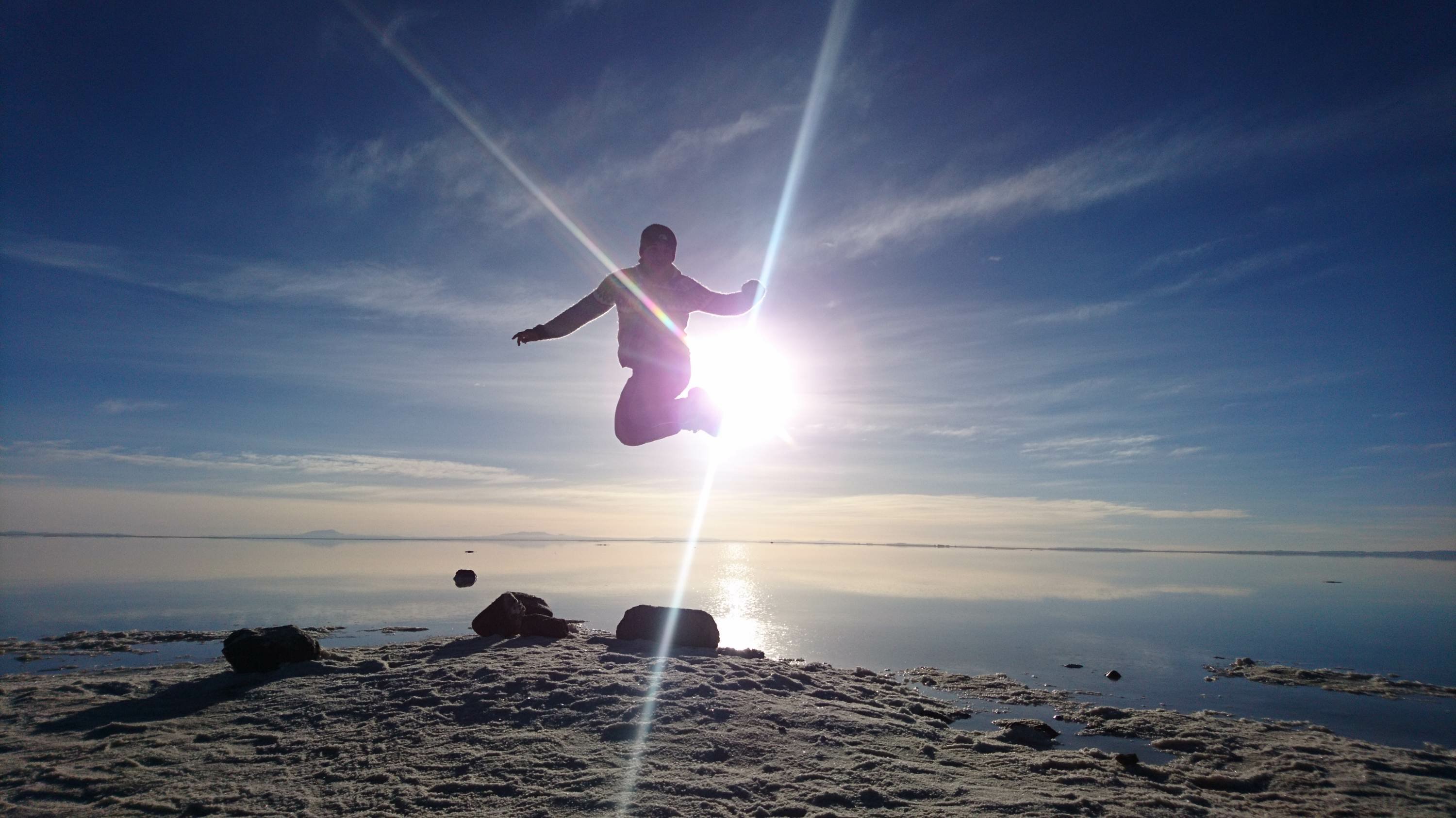 Das sichere Ufer kam näher, da passierte es. Wir hatten es geschafft ohne stecken zu bleiben 🙂 Die Musik wurde aufgedreht und die Party in der Salar de Uyuni konnte beginnen. Yeah. Als erstens hatten wir ein wenig Zeit für Fotos.