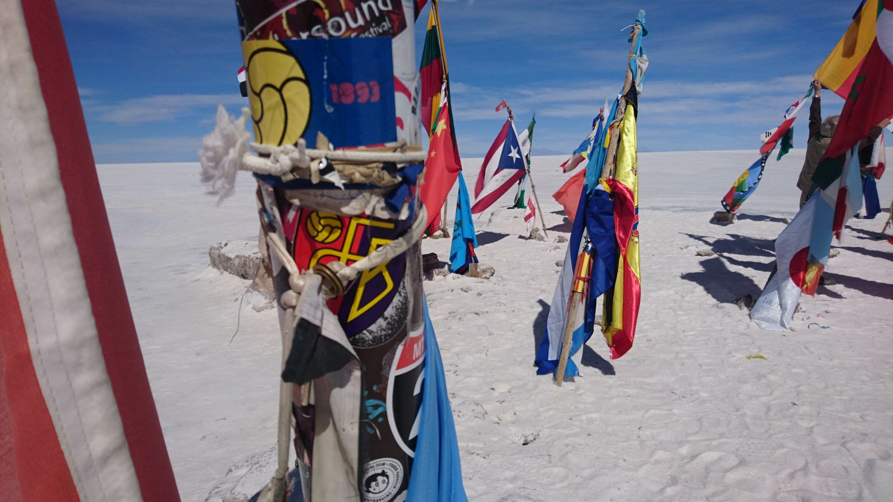 Beim ersten Salzhotel, welches mitten in der Salzwüste steht, gibt es noch eine Flaggensammlung der Welt. Analog auf einem Berggipfel, hängte da wahrscheinlich jeder seine Flagge auf und so entstand dieses Gebilde, welches sehr bunt heraussticht.